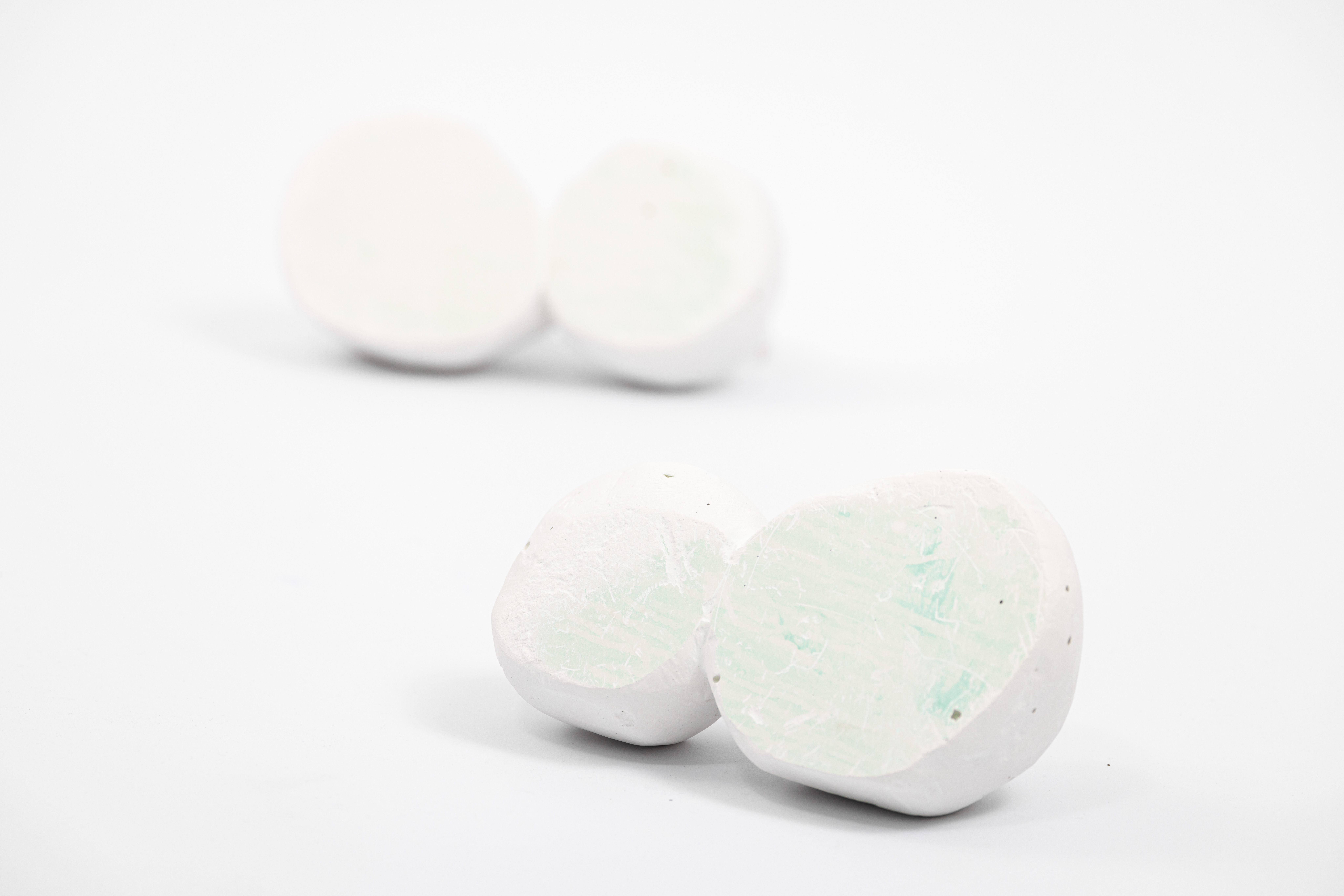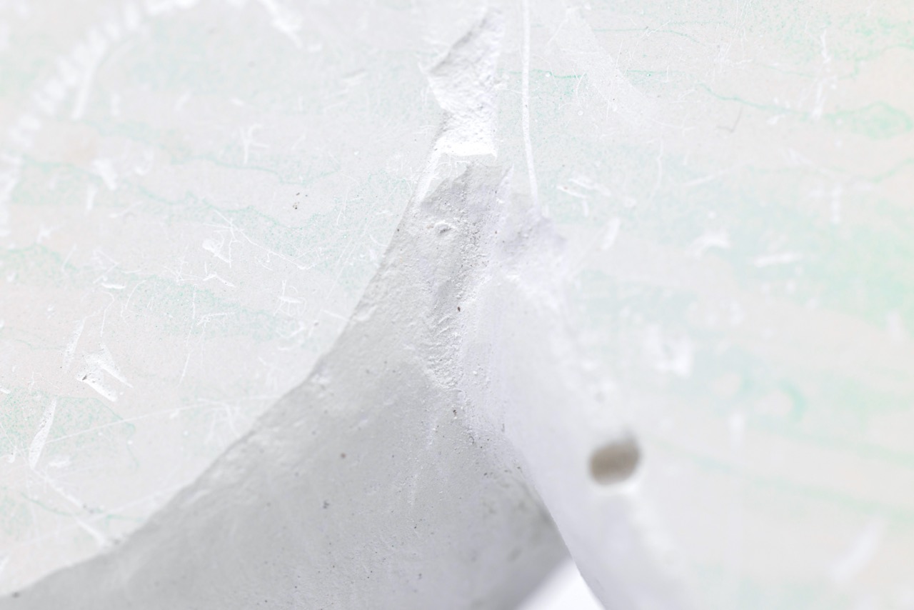 "Eyeball" (2020) plaster fragment from renovation site -- a set of two photos by Long Tse